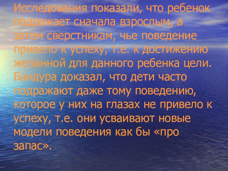 поведение привело к успеху, т.е. к достижению желанной для данного ребенка цели. Бандура доказал, что дети часто подражают даже тому поведению, которое у них на глазах не привело к успеху, т.е. они усваивают новые модели поведения как бы «про запас».