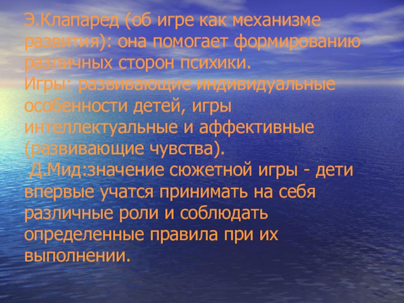 Слайд 26Э.Клапаред (об игре как механизме развития): она помогает формированию различных сторон