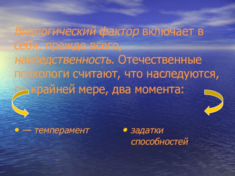 Слайд 14Биологический фактор включает в себя, прежде всего, наследственность. Отечественные психологи считают,