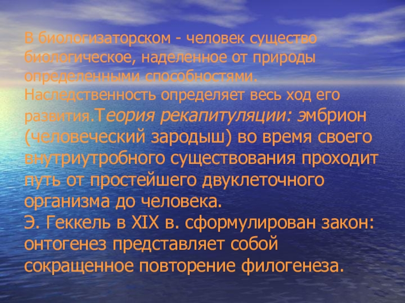 Слайд 11В биологизаторском - человек существо биологическое, наделенное от природы определенными способностями.