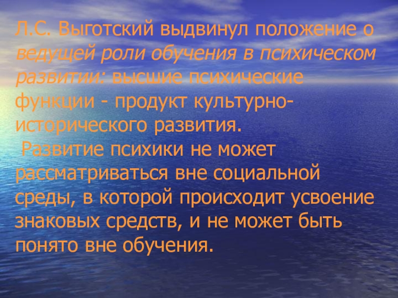 Развитие психики не может рассматриваться вне социальной среды, в которой происходит усвоение знаковых средств, и не может быть понято вне обучения.