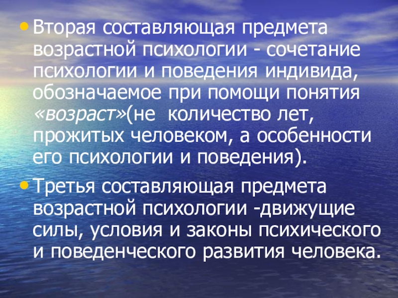 Слайд 4Вторая составляющая предмета возрастной психологии - сочетание психологии и поведения индивида,