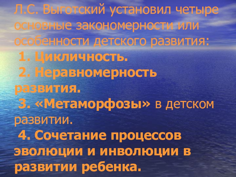 Слайд 19Л.С. Выготский установил четыре основные закономерности или особенности детского развития: