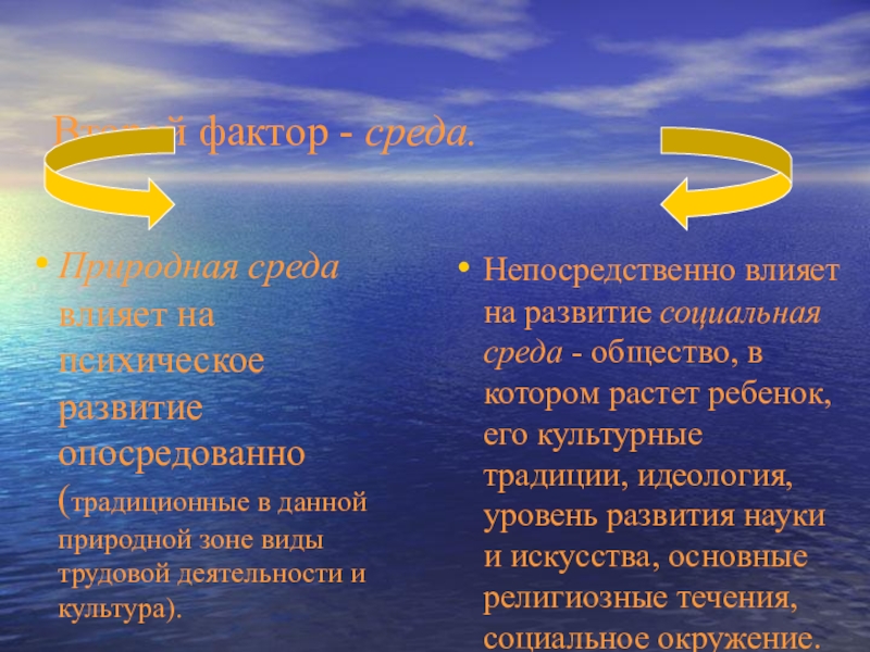 Непосредственно влияет на развитие социальная среда - общество, в котором растет ребенок, его культурные традиции, идеология, уровень развития науки и искусства, основные религиозные течения, социальное окружение.