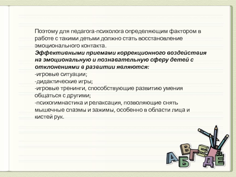 Слайд 12Поэтому для педагога-психолога определяющим фактором в работе с такими детьми должно