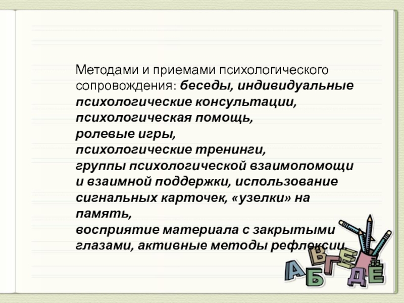 Слайд 10Методами и приемами психологического сопровождения: беседы, индивидуальные психологические консультации,