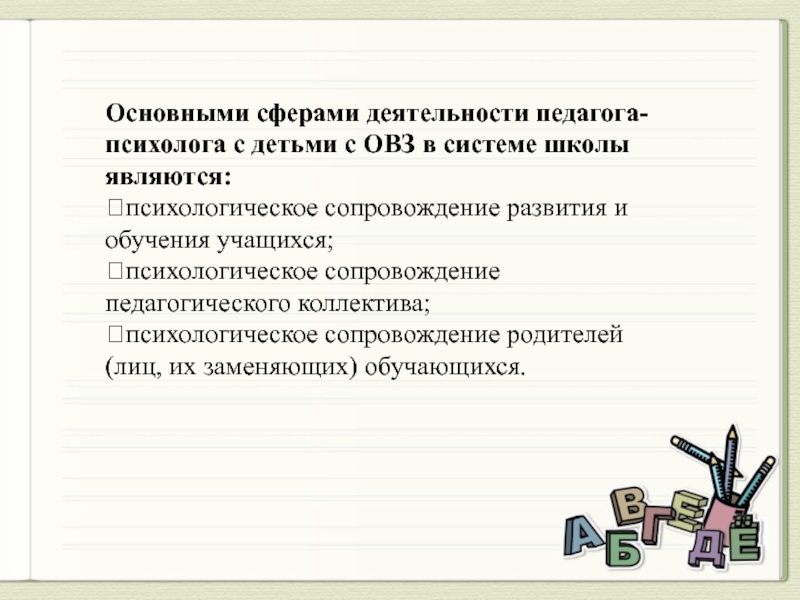 Слайд 6Основными сферами деятельности педагога-психолога с детьми с ОВЗ в системе школы