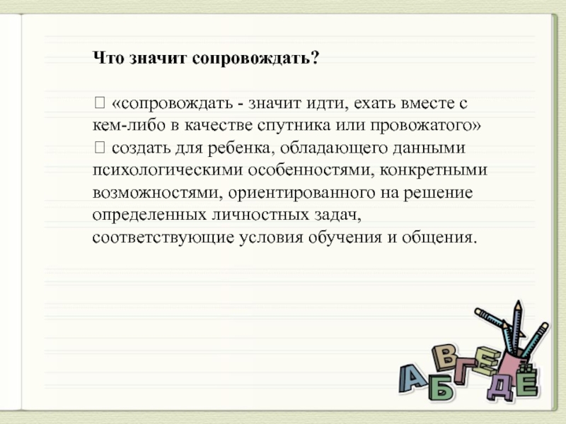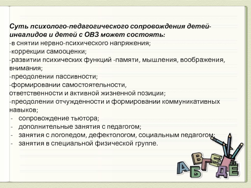 Слайд 9Суть психолого-педагогического сопровождения детей-инвалидов и детей с ОВЗ может состоять: