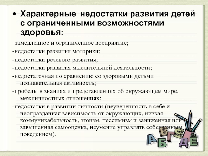 Слайд 4Характерные недостатки развития детей с ограниченными возможностями здоровья: