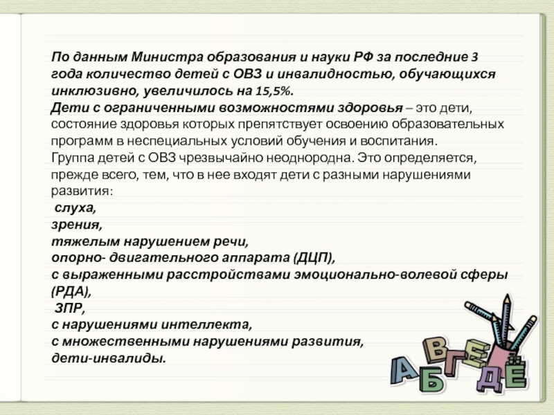 Группа детей с ОВЗ чрезвычайно неоднородна. Это определяется, прежде всего, тем, что в нее входят дети с разными нарушениями развития: