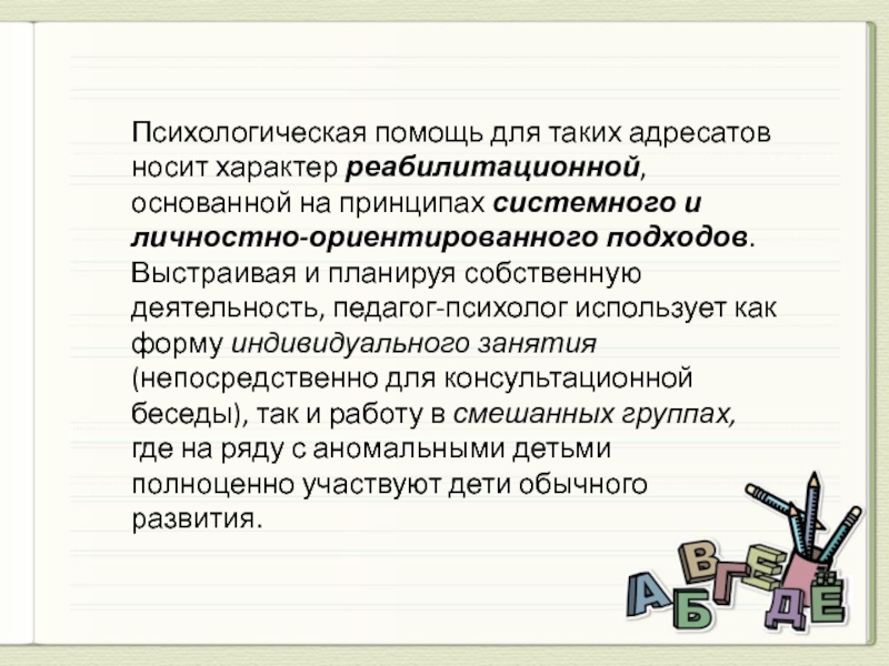 Слайд 8Психологическая помощь для таких адресатов носит характер реабилитационной, основанной на принципах