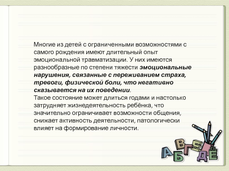Слайд 11Многие из детей с ограниченными возможностями с самого рождения имеют длительный