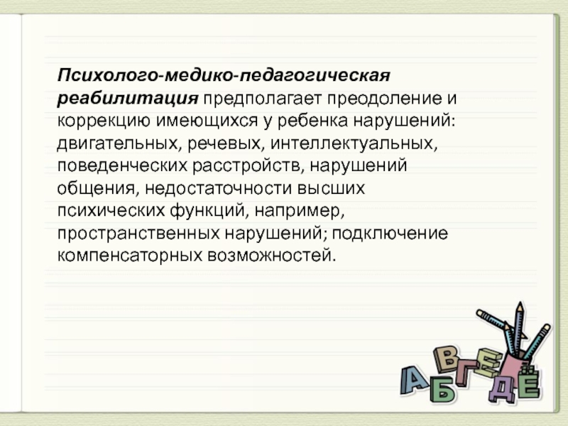 Слайд 7Психолого-медико-педагогическая реабилитация предполагает преодоление и коррекцию имеющихся у ребенка нарушений: двигательных,