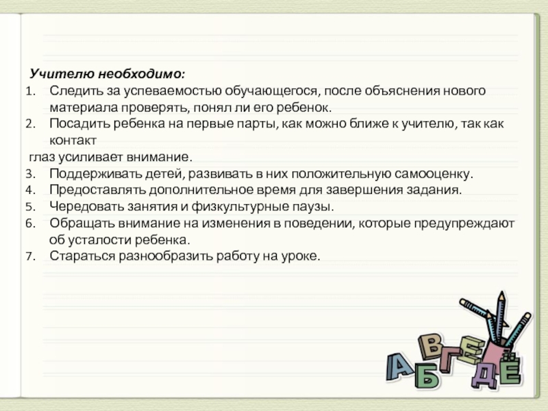Посадить ребенка на первые парты, как можно ближе к учителю, так как контакт