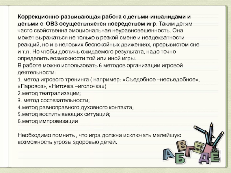 Слайд 13Коррекционно-развивающая работа с детьми-инвалидами и детьми с ОВЗ осуществляется посредством игр.