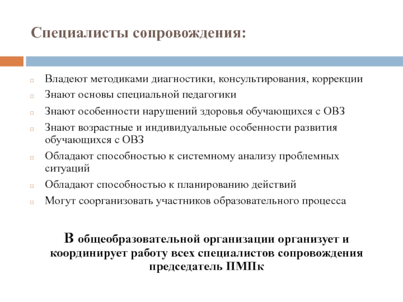 В общеобразовательной организации организует и координирует работу всех специалистов сопровождения председатель ПМПк