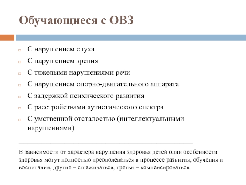 В зависимости от характера нарушения здоровья детей одни особенности здоровья могут полностью преодолеваться в процессе развития, обучения и воспитания, другие – сглаживаться, третьи – компенсироваться.