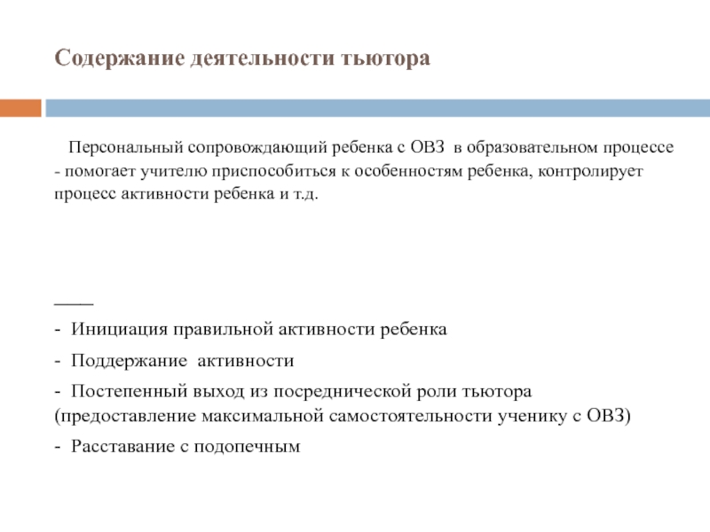 - Постепенный выход из посреднической роли тьютора (предоставление максимальной самостоятельности ученику с ОВЗ)