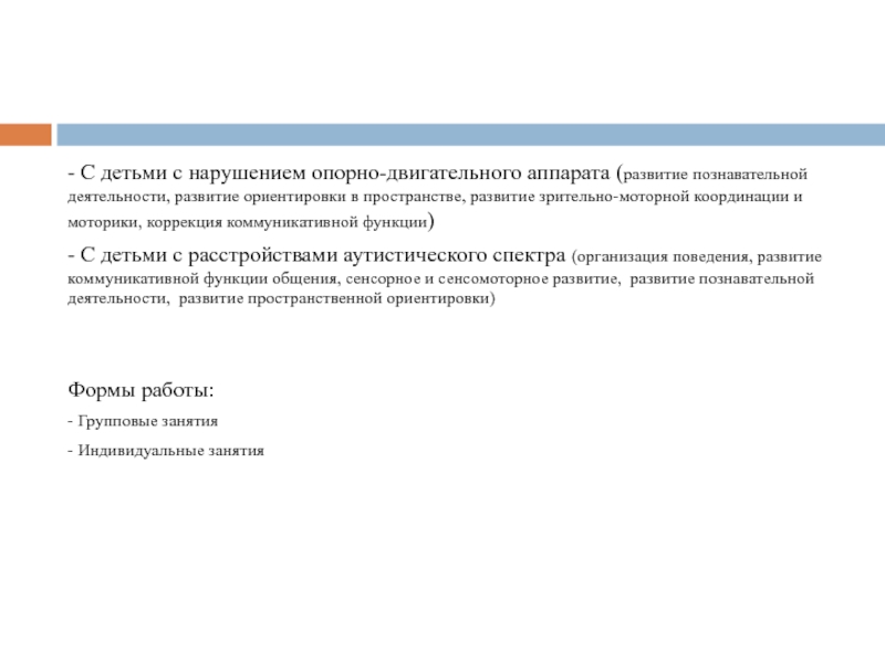 - С детьми с расстройствами аутистического спектра (организация поведения, развитие коммуникативной функции общения, сенсорное и сенсомоторное развитие, развитие познавательной деятельности, развитие пространственной ориентировки)
