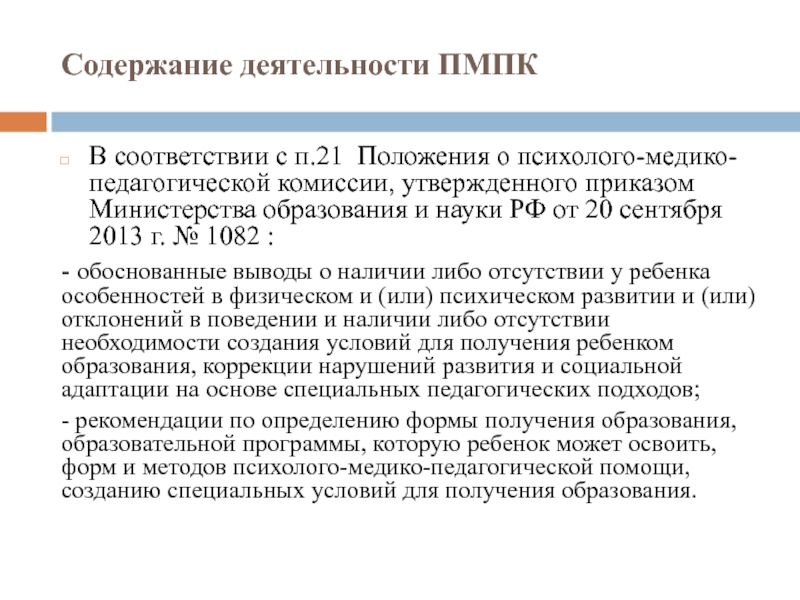 - обоснованные выводы о наличии либо отсутствии у ребенка особенностей в физическом и (или) психическом развитии и (или) отклонений в поведении и наличии либо отсутствии необходимости создания условий для получения ребенком образования, коррекции нарушений развития и социальной адаптации на основе специальных педагогических подходов;