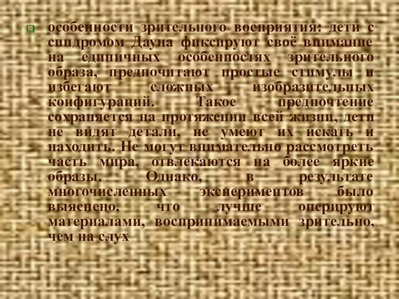 единичных особенностях зрительного образа, предпочитают простые стимулы и избегают сложных изобразительных конфигураций. Такое предпочтение сохраняется на протяжении всей жизни, дети не видят детали, не умеют их искать и находить. Не могут внимательно рассмотреть часть мира, отвлекаются на более яркие образы. Однако, в результате многочисленных экспериментов было выяснено, что лучше оперируют материалами, воспринимаемыми зрительно, чем на слух
