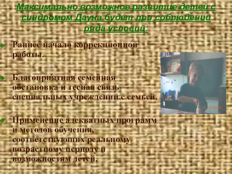 Слайд 19Максимально возможное развитие детей с синдромом Дауна будет при соблюдении ряда