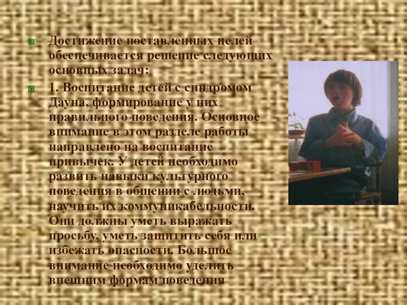 синдромом Дауна, формирование у них правильного поведения. Основное внимание в этом разделе работы направлено на воспитание привычек. У детей необходимо развить навыки культурного поведения в общении с людьми, научить их коммуникабельности. Они должны уметь выражать просьбу, уметь защитить себя или избежать опасности. Большое внимание необходимо уделить внешним формам поведения