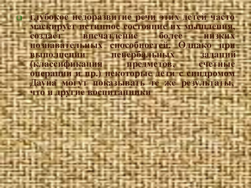 создает впечатление более низких познавательных способностей. Однако при выполнении невербальных заданий (классификация предметов, счетные операции и пр.) некоторые дети с синдромом Дауна могут показывать те же результаты, что и другие воспитанники