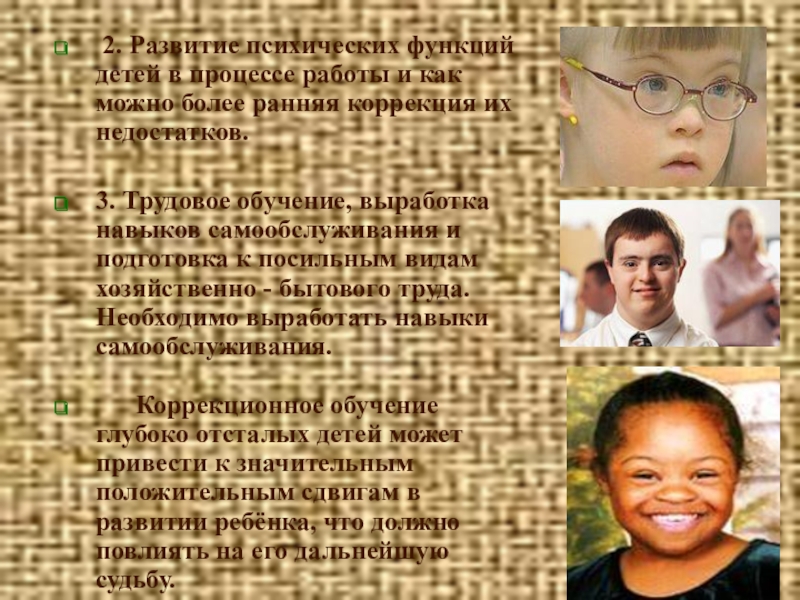 Коррекционное обучение глубоко отсталых детей может привести к значительным положительным сдвигам в развитии ребёнка, что должно повлиять на его дальнейшую судьбу.