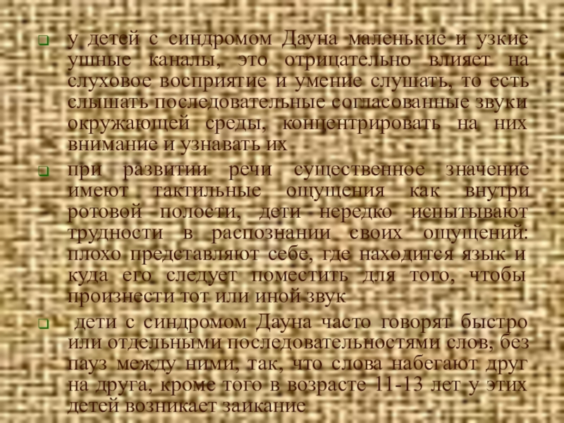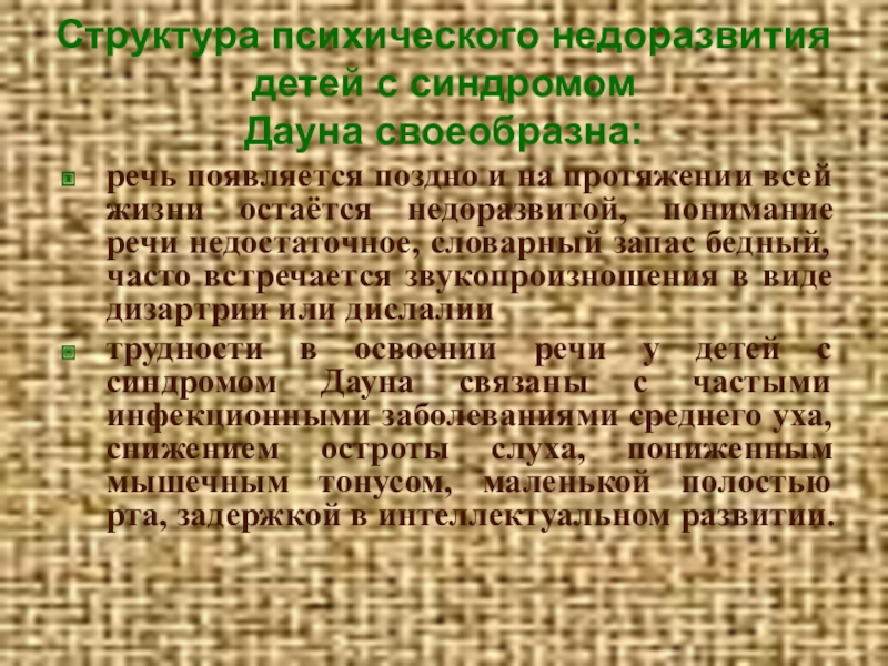 трудности в освоении речи у детей с синдромом Дауна связаны с частыми инфекционными заболеваниями среднего уха, снижением остроты слуха, пониженным мышечным тонусом, маленькой полостью рта, задержкой в интеллектуальном развитии.