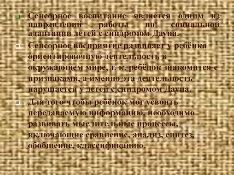 Сенсорное восприятие развивает у ребёнка ориентировочную деятельность в окружающем мире, т. к. ребёнок знакомится с признаками, а именно эта деятельность нарушается у детей с синдромом Дауна.