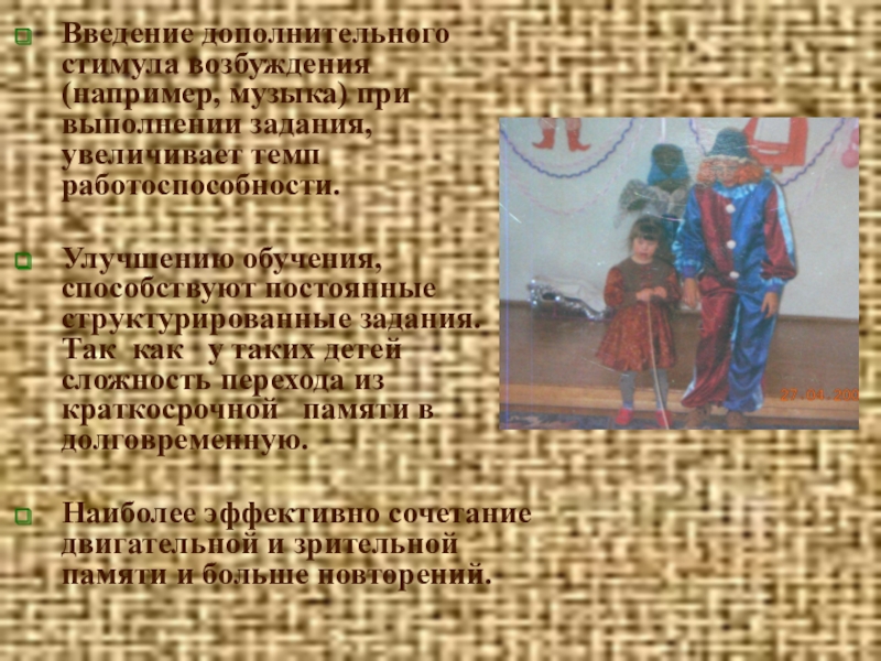 Слайд 17Введение дополнительного стимула возбуждения (например, музыка) при выполнении задания, увеличивает темп