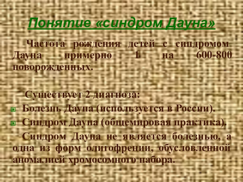 Синдром Дауна не является болезнью, а одна из форм олигофрении, обусловленной аномалией хромосомного набора.