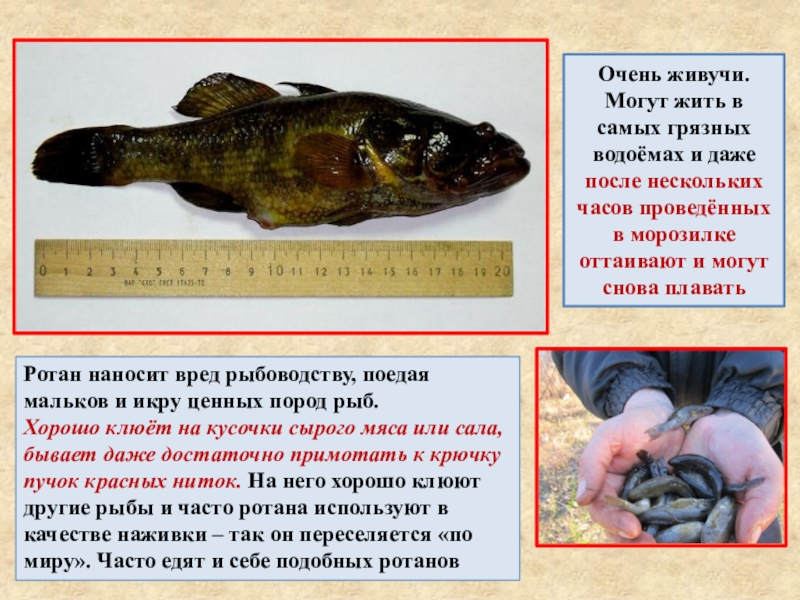 Ротан наносит вред рыбоводству, поедая мальков и икру ценных пород рыб.