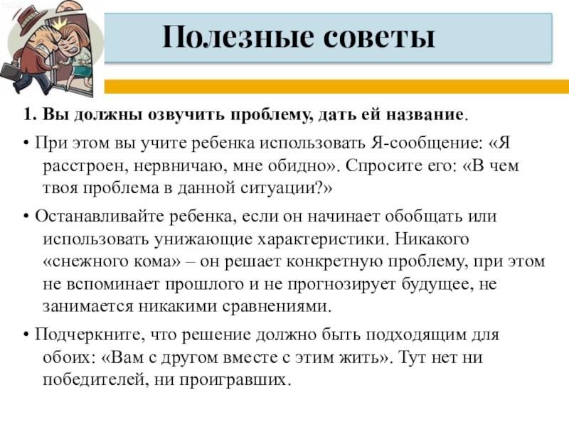 • Останавливайте ребенка, если он начинает обобщать или использовать унижающие характеристики. Никакого «снежного кома» – он решает конкретную проблему, при этом не вспоминает прошлого и не прогнозирует будущее, не занимается никакими сравнениями.