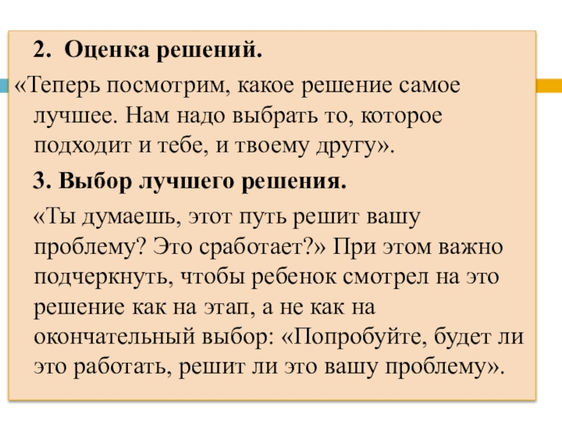 «Ты думаешь, этот путь решит вашу проблему? Это сработает?» При этом важно подчеркнуть, чтобы ребенок смотрел на это решение как на этап, а не как на окончательный выбор: «Попробуйте, будет ли это работать, решит ли это вашу проблему».