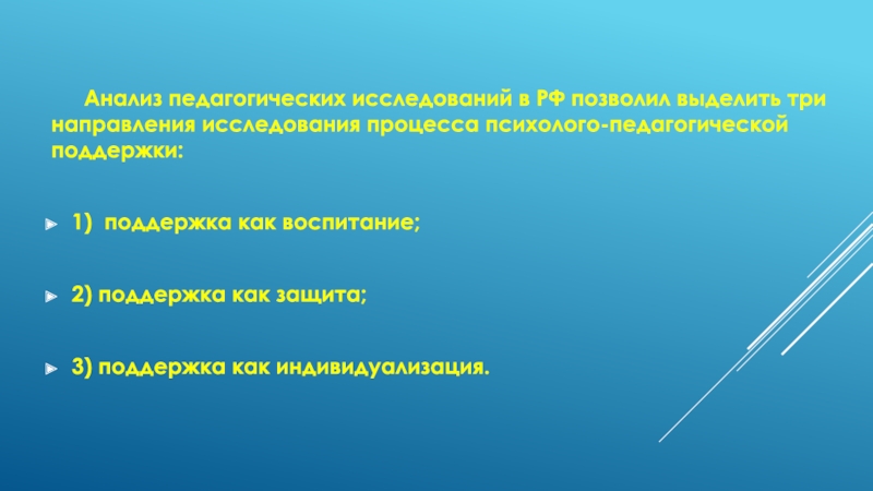 Анализ педагогических исследований в РФ позволил выделить три направления исследования процесса психолого-педагогической поддержки: 1)  поддержка как воспитание; 2)