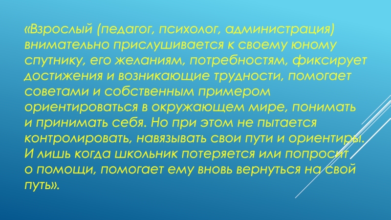 Слайд 5«Взрослый (педагог, психолог, администрация) внимательно прислушивается к своему юному спутнику, его желаниям,