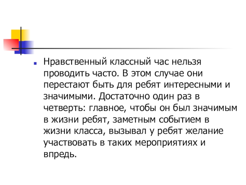 Нравственный классный час нельзя проводить часто. В этом случае они перестают