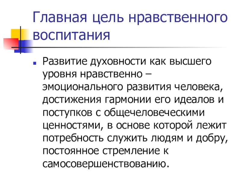 эмоционального развития человека, достижения гармонии его идеалов и поступков с общечеловеческими ценностями, в основе которой лежит потребность служить людям и добру, постоянное стремление к самосовершенствованию.