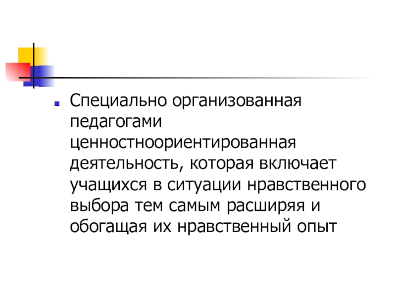 Специально организованная педагогами ценностноориентированная деятельность, которая включает учащихся в ситуации нравственного