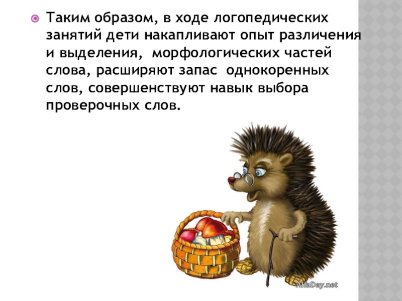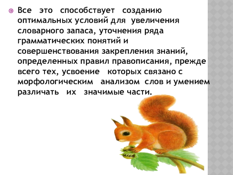 выделения, морфологических частей слова, расширяют запас однокоренных слов, совершенствуют навык выбора проверочных слов.