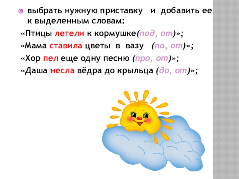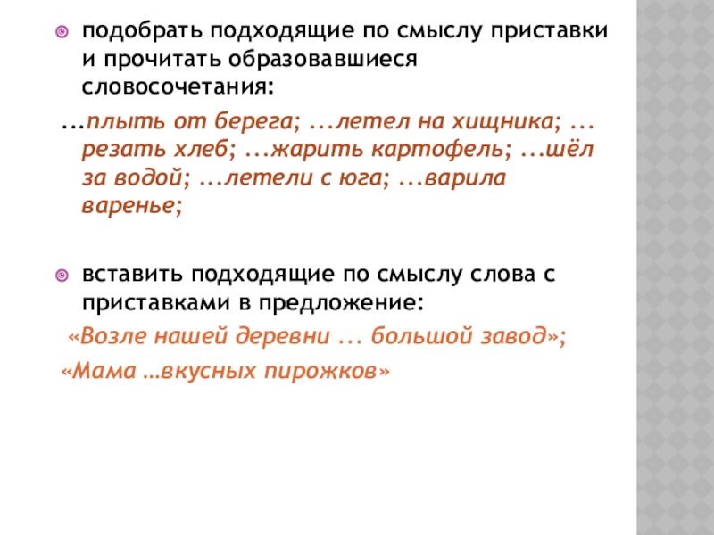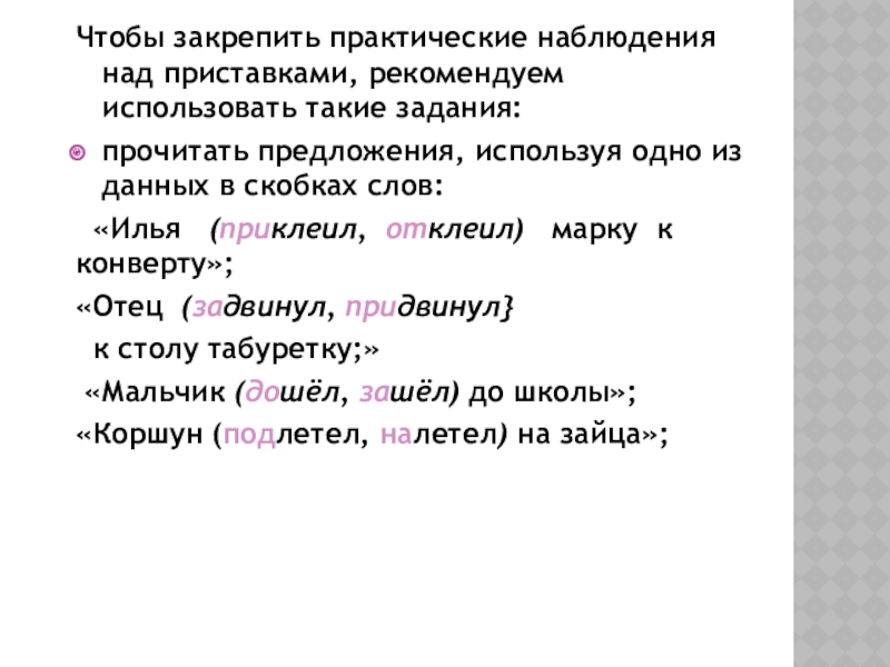 Слайд 12Чтобы закрепить практические наблюдения над приставками, рекомендуем использовать такие задания: