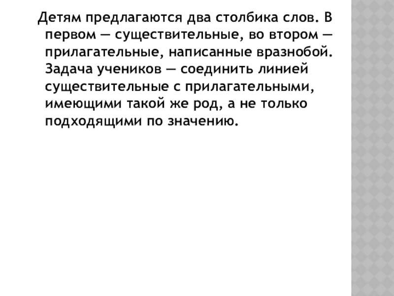 втором — прилагательные, написанные вразнобой. Задача учеников — соединить линией существительные с прилагательными, имеющими такой же род, а не только подходящими по значению.