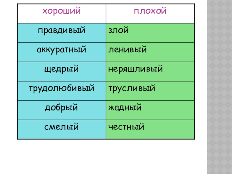 столбика слов. В первом написаны прилагательные, обозначающие черты характера плохого человека, а во втором — хорошего.