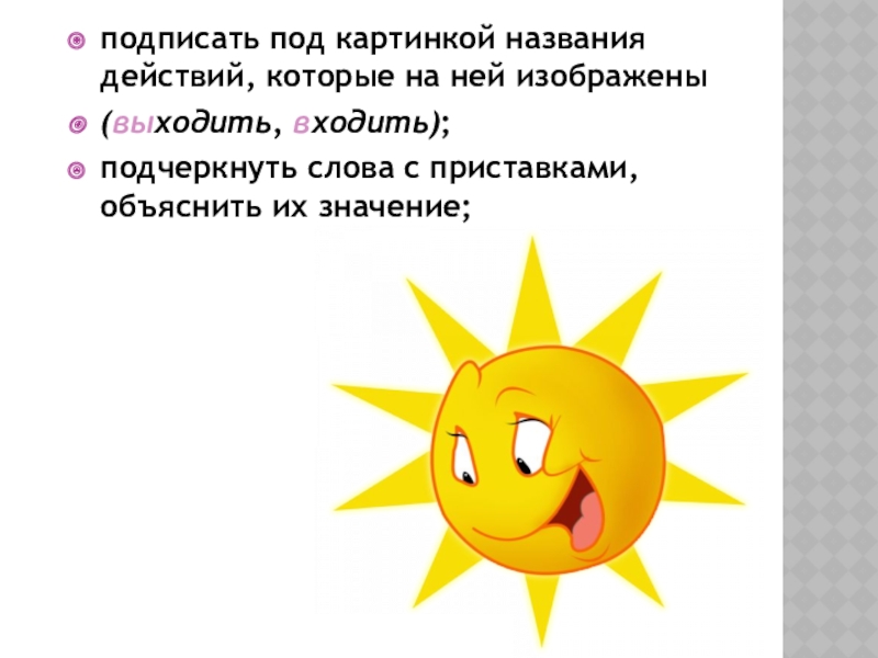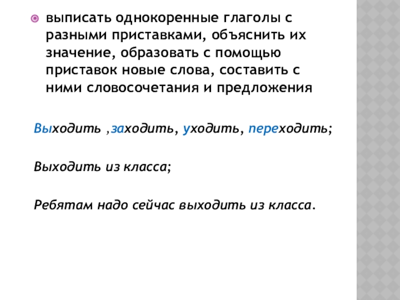 Слайд 7выписать однокоренные глаголы с разными приставками, объяснить их значение, образовать с