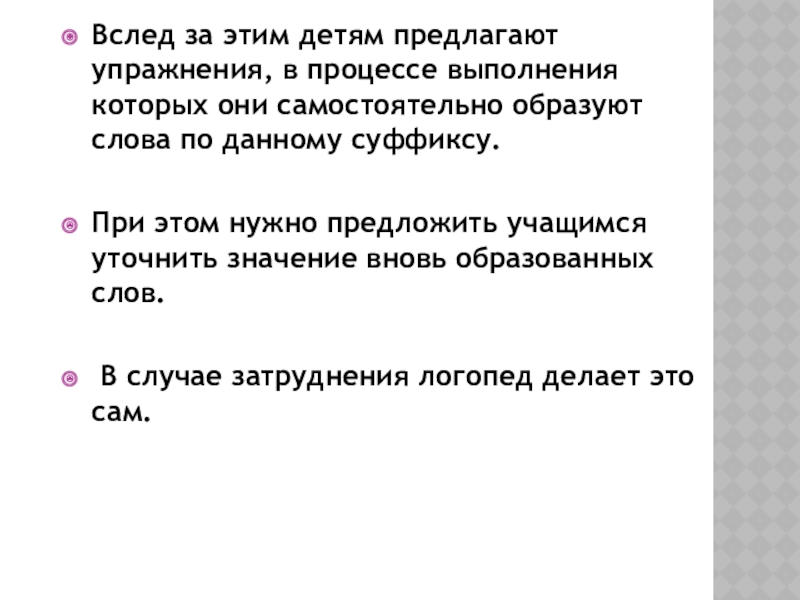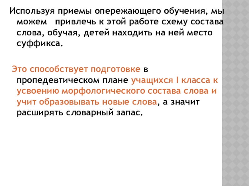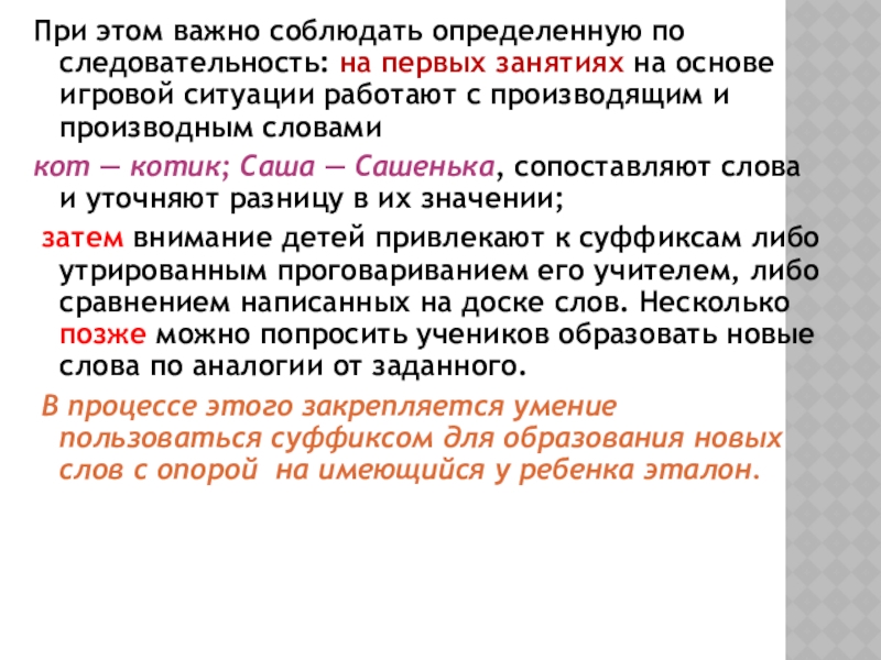 затем внимание детей привлекают к суффиксам либо утрированным проговариванием его учителем, либо сравнением написанных на доске слов. Несколько позже можно попросить учеников образовать новые слова по аналогии от заданного.