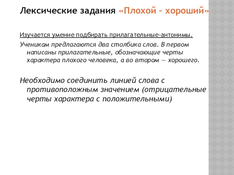 Необходимо соединить линией слова с противоположным значением (отрицательные черты характера с положительными)
