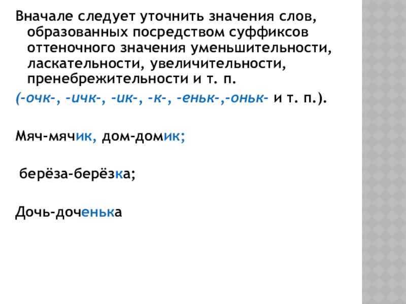 Слайд 16Вначале следует уточнить значения слов, образованных посредством суффиксов оттеночного значения уменьшительности,