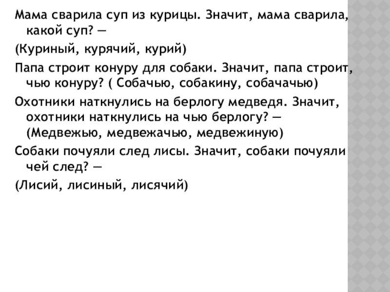 Слайд 33Мама сварила суп из курицы. Значит, мама сварила, какой суп? —